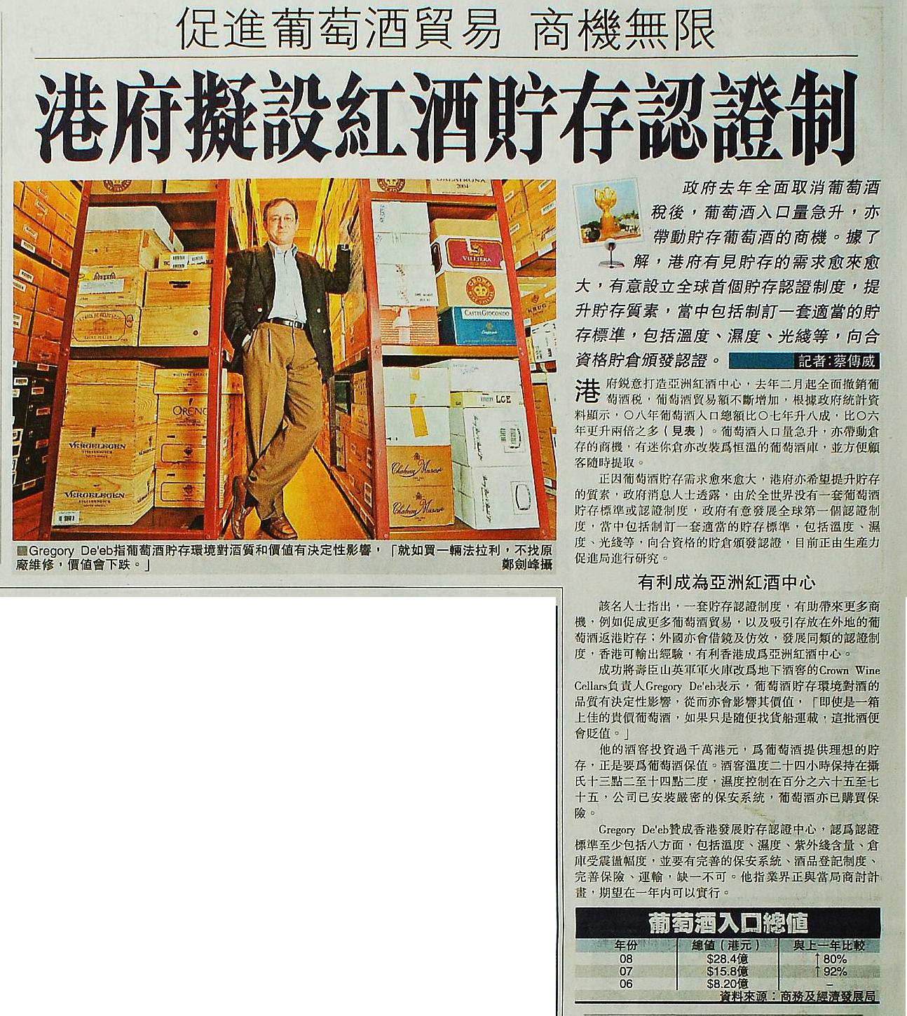 政府去年全面取消葡萄酒稅後,葡萄酒入口量急升,亦帶動貯存葡萄酒的商機。據了解,港府有見貯存的需求愈來愈大,有意設立全球首個貯存認證制度,提升貯存質素,當中包括制訂一套適當的貯存標準,包括溫度、濕度、光綫等,向合資格貯倉頒發認證。